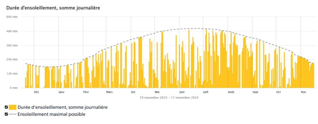Mais les évènements de l’été prennent racine en octobre 2023 déjà. Voire à l’invention du moteur à vapeur… Encore une fois, les stations MétéoSuisse de Mottec et celle du SLF à la Corne de Sorebois sont les références locales. Je me fie aussi à ma Netatmo privée au mayen des Clautis. Les graphiques ci-dessous ne sont que des images, cliquez pour arriver à la station MétéoSuisse et consulter les données publiques.