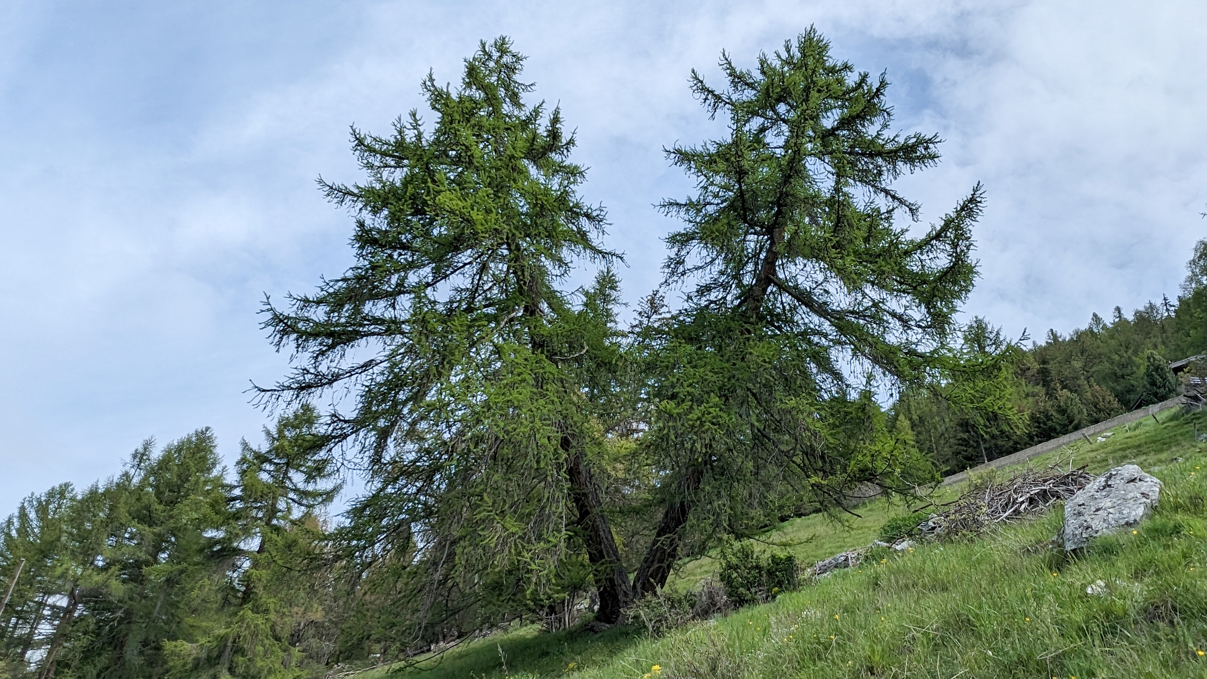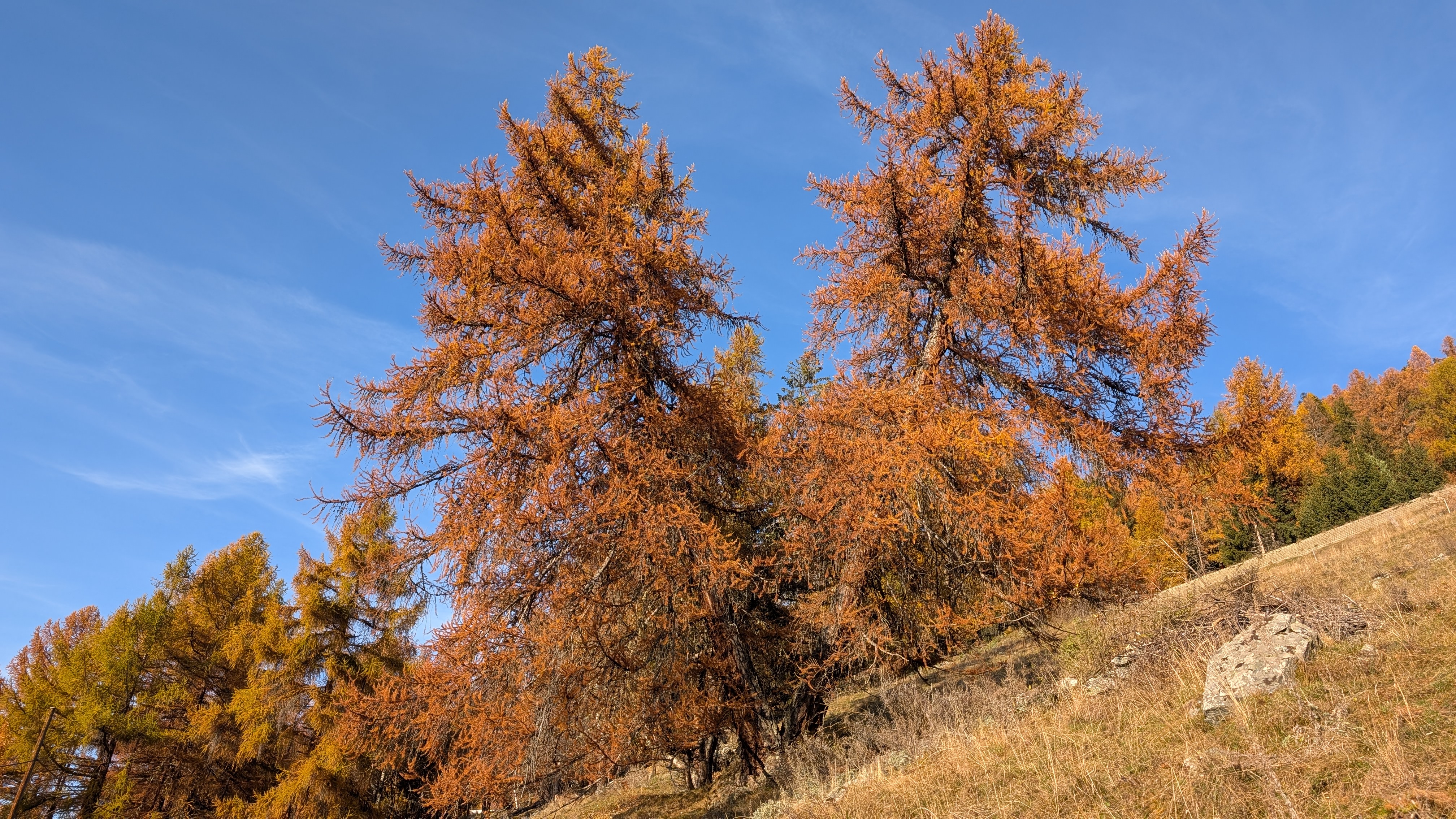 Suite au printemps poussif, la végétation s’est rattrapée dès les chaleurs de juin, les paysans sont contents de la fenaison 2024. La mauvaise publicité des problèmes de la route et l’été tardif n’ont pas favorisé la saison touristique, la neige en haute montagne et les dégâts énormes aux chemins pédestres non plus, même si nous étions heureux de marcher sur les névés d’antan. Les glaciologues médiatisés se réjouissaient de la protection que cette grosse couche offrirait aux glaciers; très mélangée aux sables du Sahara, la neige sale n’a pas résisté longtemps au soleil estival. Au bilan, la perte de masse des glaciers est quasi identique aux années précédentes. La météo s’est montrée dynamique et surprenante, avec un beau crachin de neige en vallée le 14 septembre déjà. Le record de chaleur fut mesuré le jour de Sierre-Zinal, soit le 10 août à 16h avec 15.9° à la Corne et 26.3 à Mottec. Le 13 septembre détient le record de froid des six mois avec -10.3° à la Corne et 0.1 à Mottec, octobre n’a pas fait mieux. Pour le vent, retenons la rafale à 92.9 km/h sud-est 159° le 29 juin, du foehn la veille des inondations de Chippis. Les vendanges furent tardives, le 3 octobre pour les parchets familiaux de fendant; qualité excellente loin des quantités espérées, malgré les nombreux soins exigés par l’humidité de la saison. L’album public été 2024 est ajouté sur la page des archives photos. Ci-dessous un exercice de style que je ne peux faire qu’avec les outils du blog; j’ai visité deux mélèze issus d’une même souche qui semblent se fuir, à St-Luc les 26 mai puis le 6 novembre. J’aime toutes les saisons en Anniviers, je retournerai voir ces compères sous leur blanc manteau.