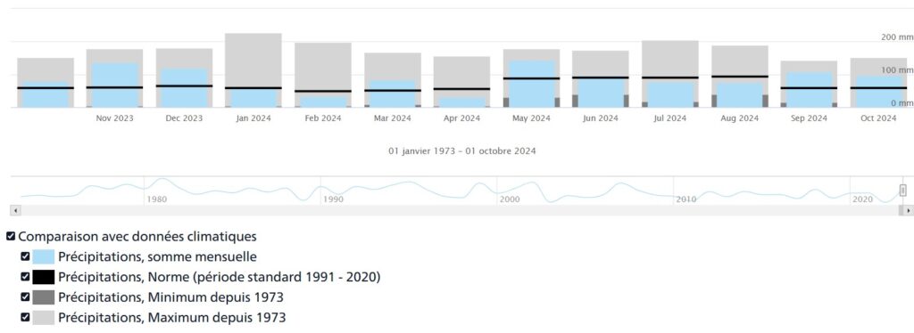 Ce n’était pas la première catastrophe à toucher Anniviers cette année, les festivités commencèrent en mars avec un éboulement qui coupa la route principale de la vallée pour plusieurs semaines. Le 30 mars, c’est l’accès par Vercorin qui subit un éboulement; nous avons brièvement été coupés du monde selon l’expression. Le pire événement pour le vallon de Zinal et les berges de la Navizence fut celui du 21 juin. Outre les dégâts sur les berges, le pont de Singlinaz est resté impraticable tout l’été, le passage entre St-Jean et Mission n’a été rétabli que début novembre, la route Vissoie-Mayoux est restée fermée jusqu’au 12 juillet. Dame Nature remit ça le samedi 29 juin, Chippis et des quartiers de Sierre se réveillèrent les pieds dans l’eau au matin du 30. Le 12 août, pendant la période la plus chaude de l’été, un orage centralisé sur Sorebois provoqua de nombreux éboulements et laves torrentielles dans le vallon de Zinal, village martyr du changement climatique. Les terrains saturés d’eau par la fonte des neiges hivernales posées sur un substrat déjà saturé des précipitations de novembre 2023, provoquèrent des dégâts jamais vus, avec la perte de nombreux terrains agricoles. La station de Mottec enregistre les précipitations depuis 1973, j’ai résumé les données des derniers étés dans le graphique interactif ci-dessous. Retrouvez au bout de ce lien la feuille des données Précipitations vallon de Zinal étés 2013-2024.