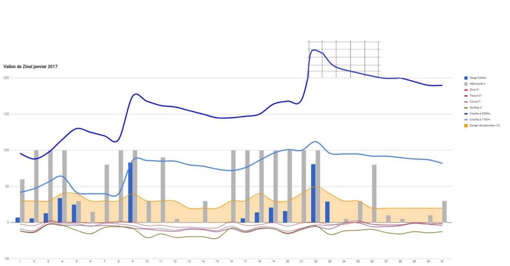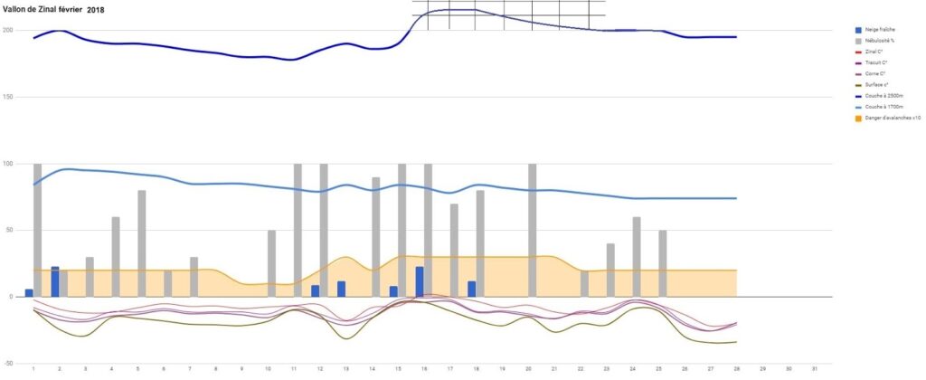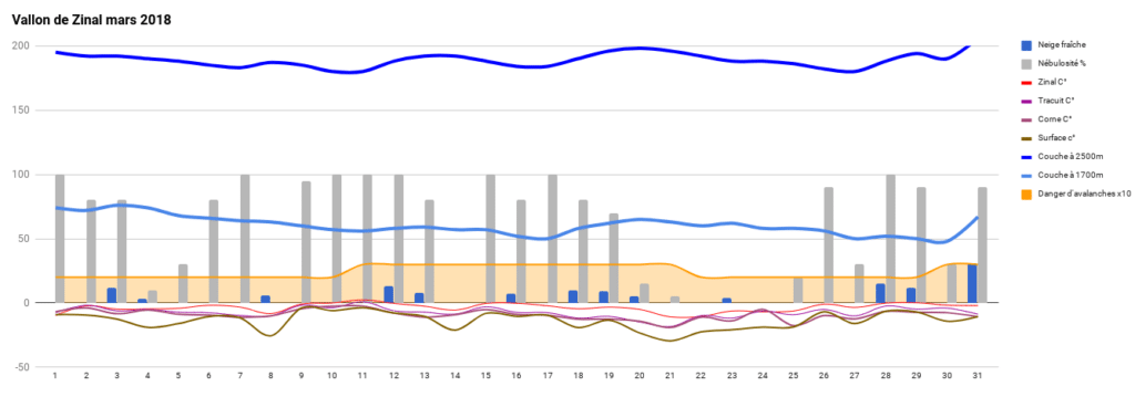 Jusqu’en début d’après-midi, le danger d’avalanches maintenu sur deux limité dans la région est quasi nul. Aucune avalanche notable sur les Gardes de Bordon où seules quelques chutes de pierres ont attiré mon attention. J’ai cessé de publier les mesures le matin sur Twitter, vous pouvez les retrouver directement sur la feuille de calcul mars 2020 régulièrement mise à jour. Je surveille le jalon de Sorebois avec le drone, les autres mesures sont disponibles via des stations en ligne et la webcam de la Vouarda. Les cabanes de haute montagne sont fermées, y compris les locaux d’hiver dans bien des cas. A Tracuit par exemple, seul un local de secours pour les personnes blessées ou perdues sera accessible.