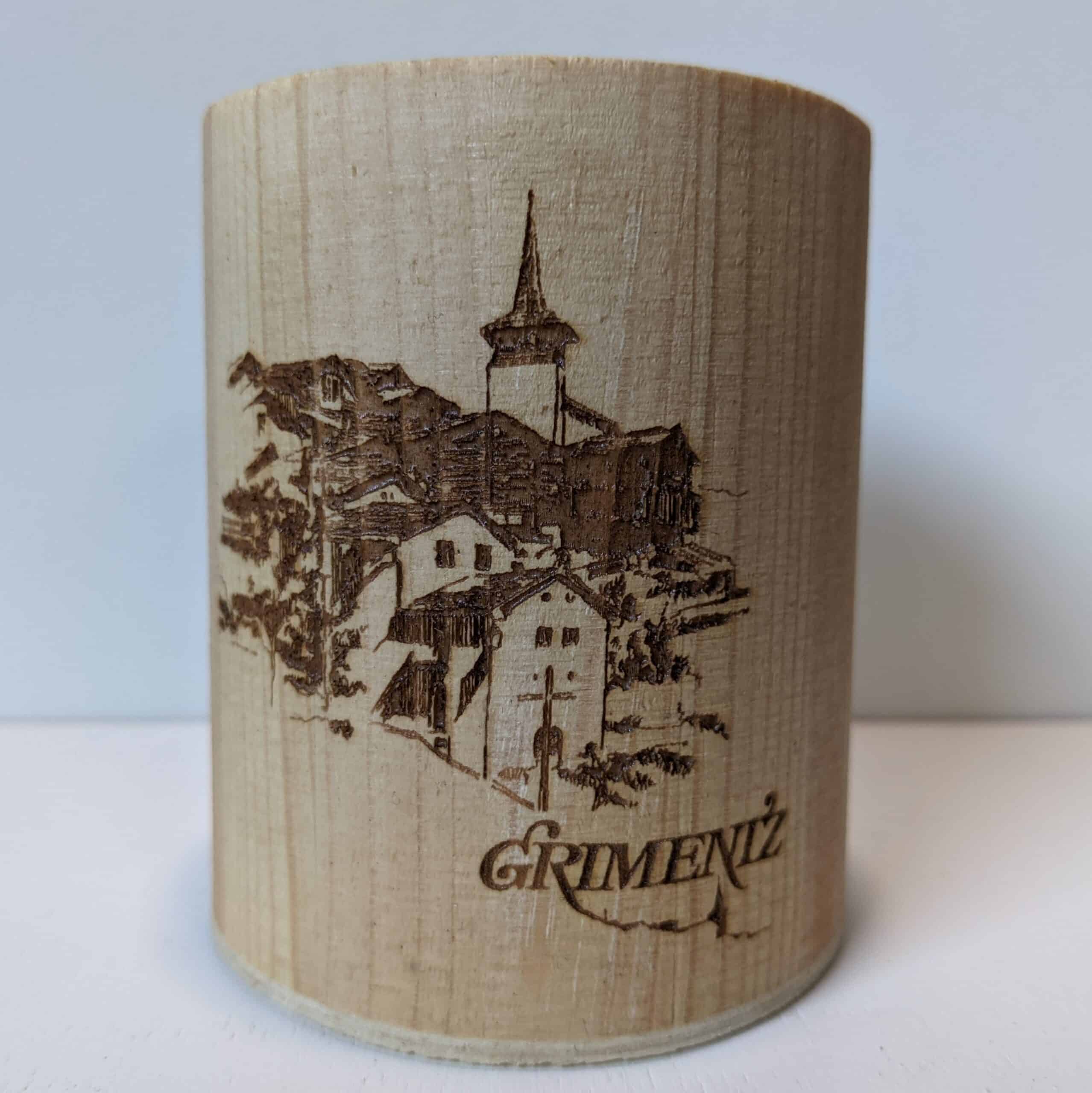 Gobelet décoratif en bois avec gravure du vieux village de Grimentz.