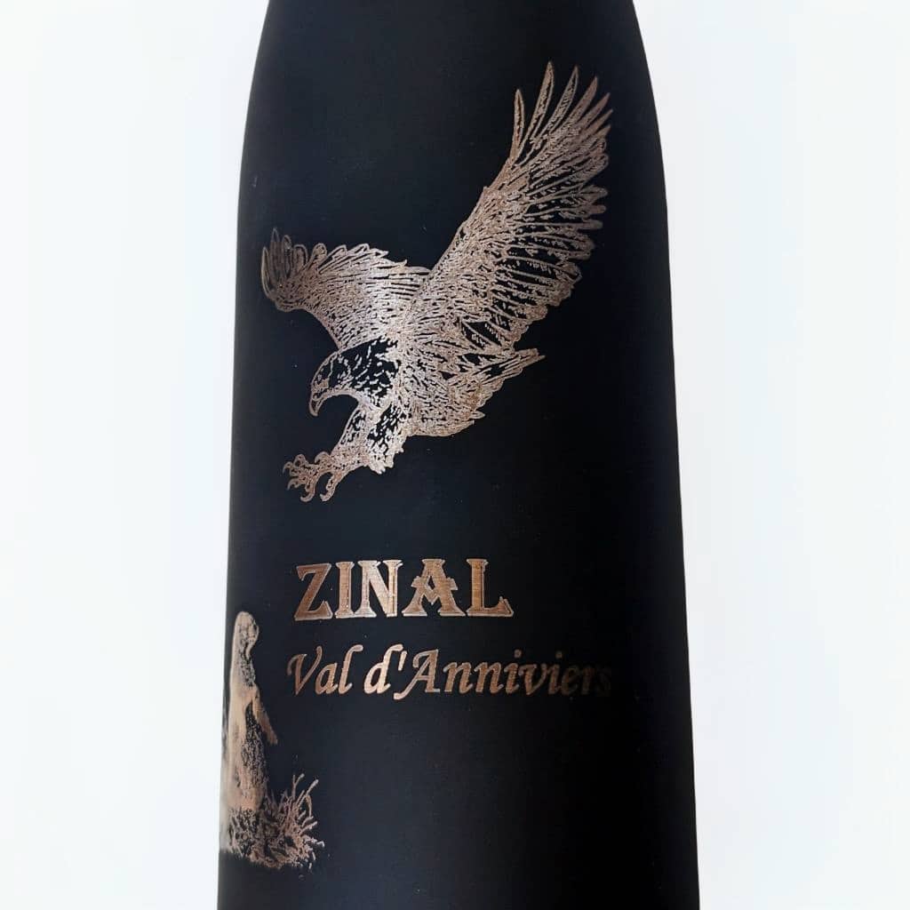 Gourde isotherme noire en métal 500ml décoré d’une gravure originale humoristique « La loi de Zinal », avec un aigle attaquant une marmotte.