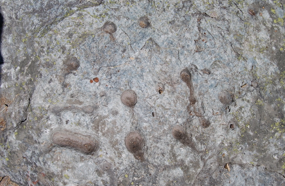 La pierre des sacrifices à l’Ilot Bosquet, deux grandes cupules en forme de pieds entourées d’un dizaine de cupules ordinaires.